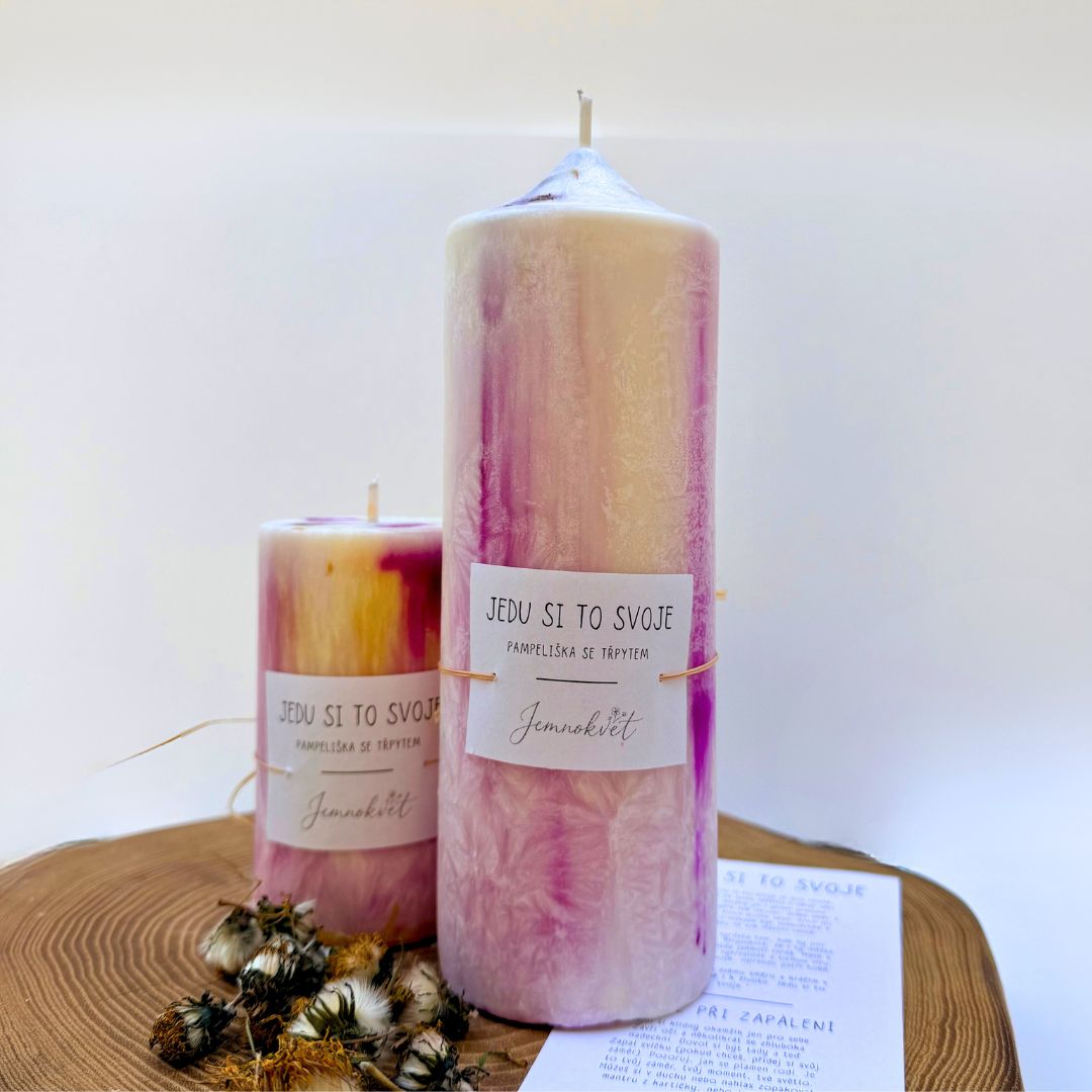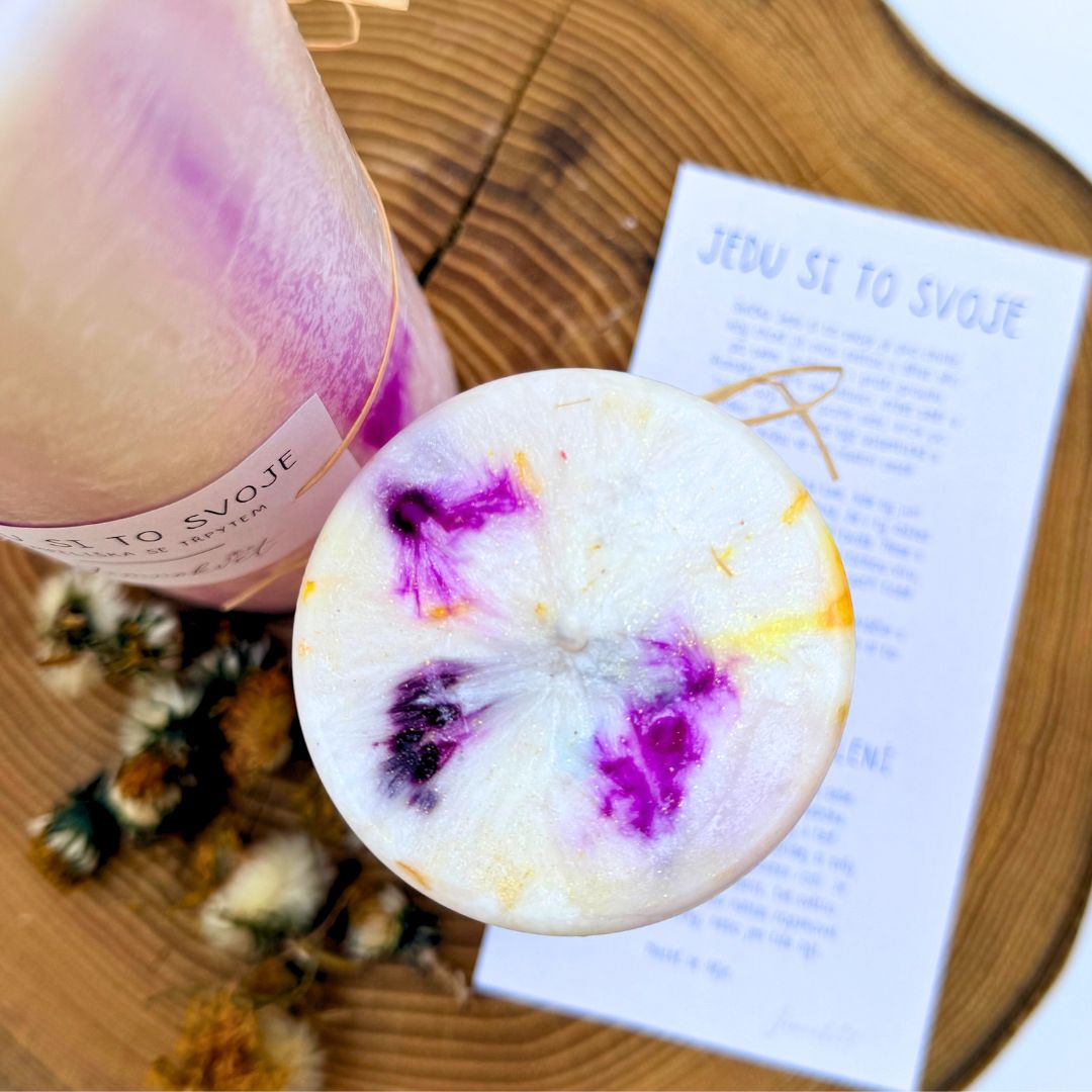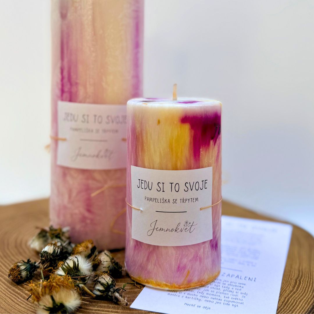Jemnokvětová svíčka Jedu si to svoje je pro chvíle, kdy chceš jít svou cestou a dělat věci po svém, možná jít i proti proudu. Pomáhá ti věřit své intuici, držet směr a tvořit svůj život podle sebe, krok po kroku. Je o odvaze být autentická a vidět krásu ve své vlastní cestě.